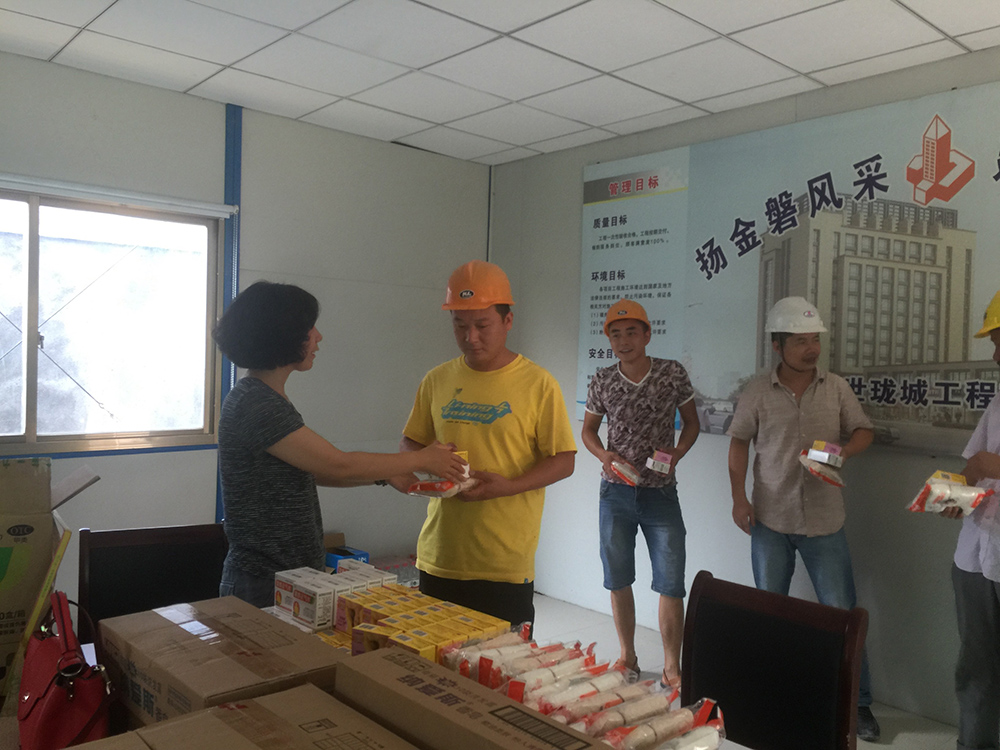 在现场慰问中,人力资源部李爱萍经理将防暑降温药品送到了部分建筑工人手中,并叮嘱他们在炎热的天气下一定要注意身体,做好防暑降温工作;对现场管理的工地负责人、各班组负责人,交代他们要合理安排工序和施工时间,确保一线工人们在酷暑期间安全生产、安全度夏。工程部张旭康、黄卫国分别询问了各个工地的工程进度情况,进一步强调加强工程安全和质量意识,在确保施工进度的同时要将安全施工放在首位,做到保质保量完成各阶段目标。