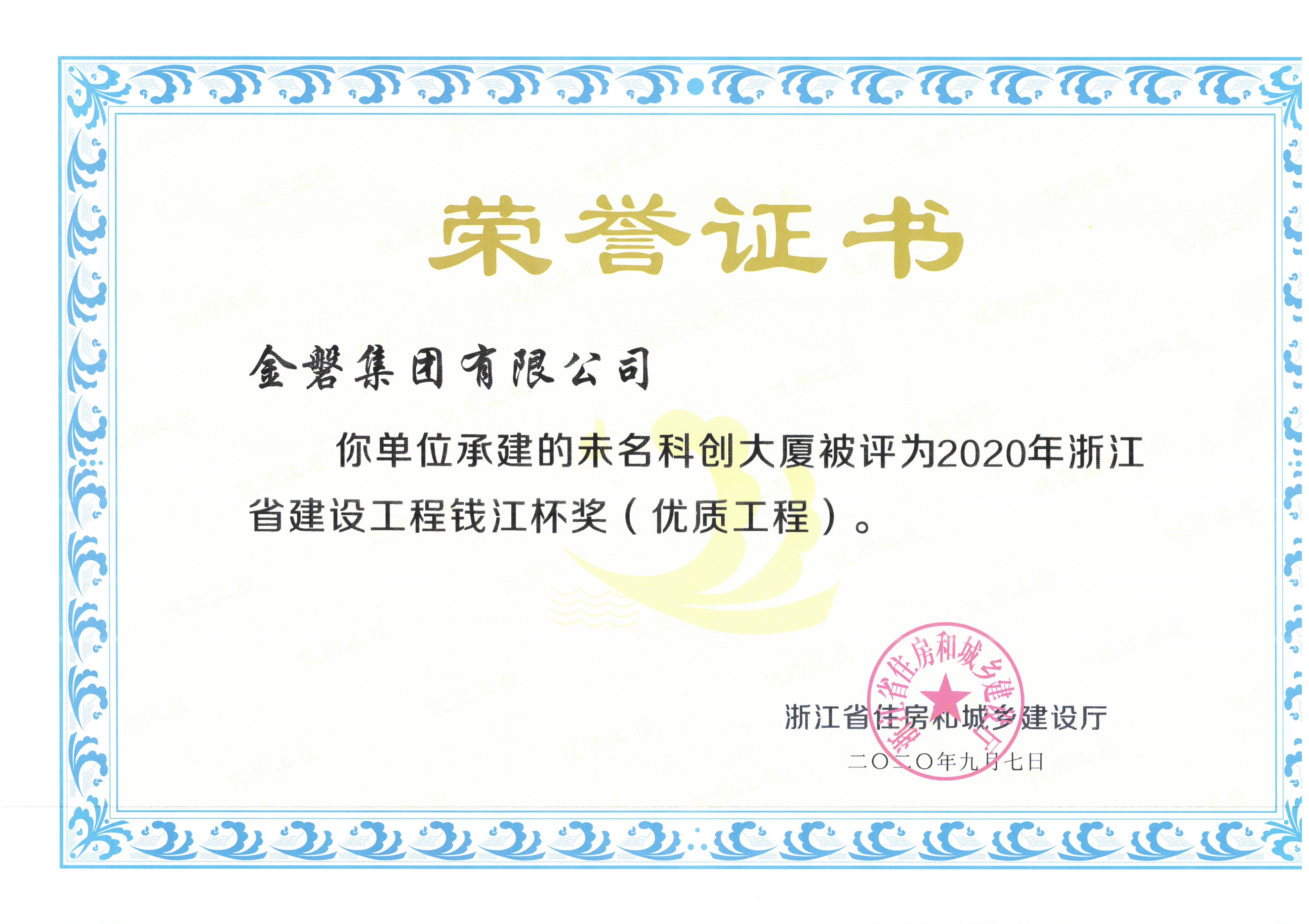 恭喜集团承建的未名科创大厦被评为2020年浙江省建设工程钱江杯奖(优质工程),集团承建的铂悦花园二标段、铂宇花园一期三标段被评为2020年度浙江省建筑施工安全生产标准化管理优良