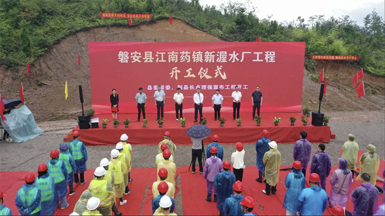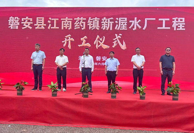 磐安县县委常委、常务副县长卢理强致辞。他指出,江南药镇新渥净水厂项目是磐安县委县政府的重大民生工程,标志着磐安县新老城区同城化供水跨入了历史性阶段,同时也标志着磐安县新城人民从“有水喝”到“喝好水”的关键转变。该工程对于新渥县的民生大计有着非常深远的影响,关系着新渥县全体人民的用水和生活质量。他希望在座包括乡镇、街道、村干部在内的相关部门领导,都要共同努力,提高认识,确保项目无障碍施工。同时他也要求施工单位按照工期要求,加快推进工作,注重创优创标,确保工程高质量完工,为提高全县人民生活质量贡献应有的智慧和力量。