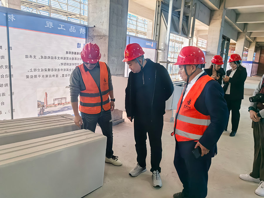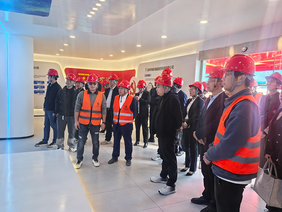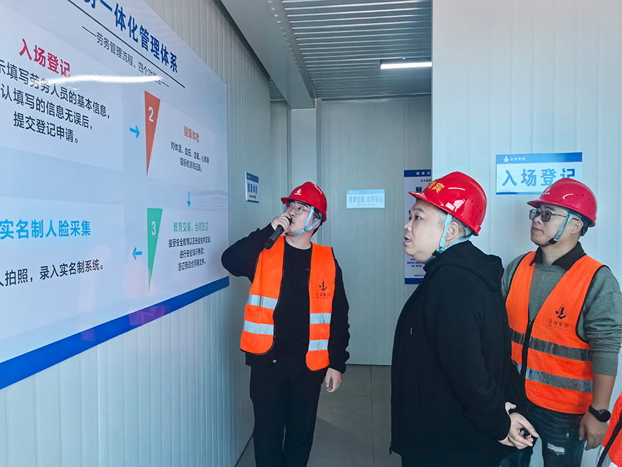 交流首先在金华市外国语学校新建项目现场拉开帷幕,张海锋一行在集团副总经理金忠祥的陪同下,深入参观了智慧工地指挥中心、劳务一体室、高支模展示区、智能电梯展示区、有限空间展示区、可调盘扣外架体系展示区、工艺样板展示区等多个区域。张海锋一行不放过任何一个细节,在边看、边听、边问中,对金外项目的整体情况有了直观的认识。随后,双方在项目会议室进一步开展交流。通过座谈,让他们更深入地了解了金外项目的施工工艺、项目管理重难点以及特色亮点做法。